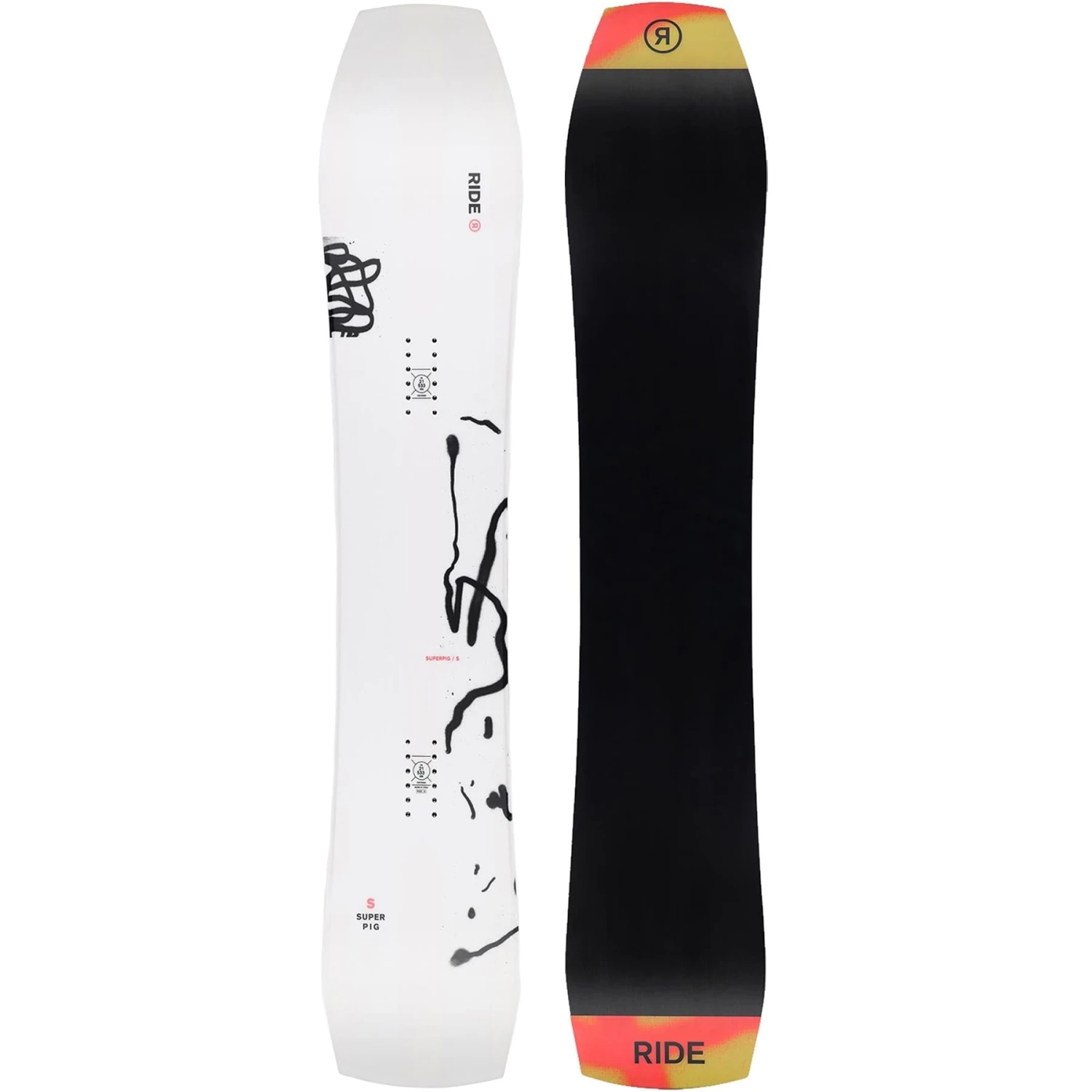 The 2024 Ride Superpig is a souped up version of the fan favourite Warpig – with a ton of added upgrades in the classic Pig shape to make this supercharged snowboard. More camber, more stiffness, and more tech make the Superpig one of the most aggressive all mountain boards on the market and is ready to give some of the most responsive riding you could ever imagine. The Superpig is made to go big, go fast, and go hard and will have you flying all over the mountain.